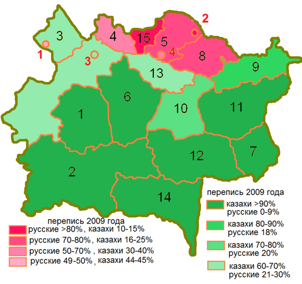 | Казахи | 687879 | 38,92% | 743098 | 48,54% | 781732 | 55,97% | 834784 | 60,56% |