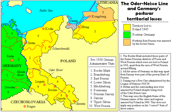 На отчуждённых от Германии территориях располагались такие крупные города Германии как Бреслау, Кёнигсберг, Штеттин, Хинденбург и Гляйвиц.