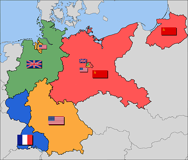 Соглашение четырёх держав-победительниц от 5 июня 1945 года вернуло границы Германии к состоянию, существующему на 31 декабря 1937 года, то есть вернуло границы Германии к границам Веймарской республики. При этом вся территория была поделена на зоны оккупации — американскую, британскую и французскую (западная и южная часть) и советскую (центральная и восточная части).