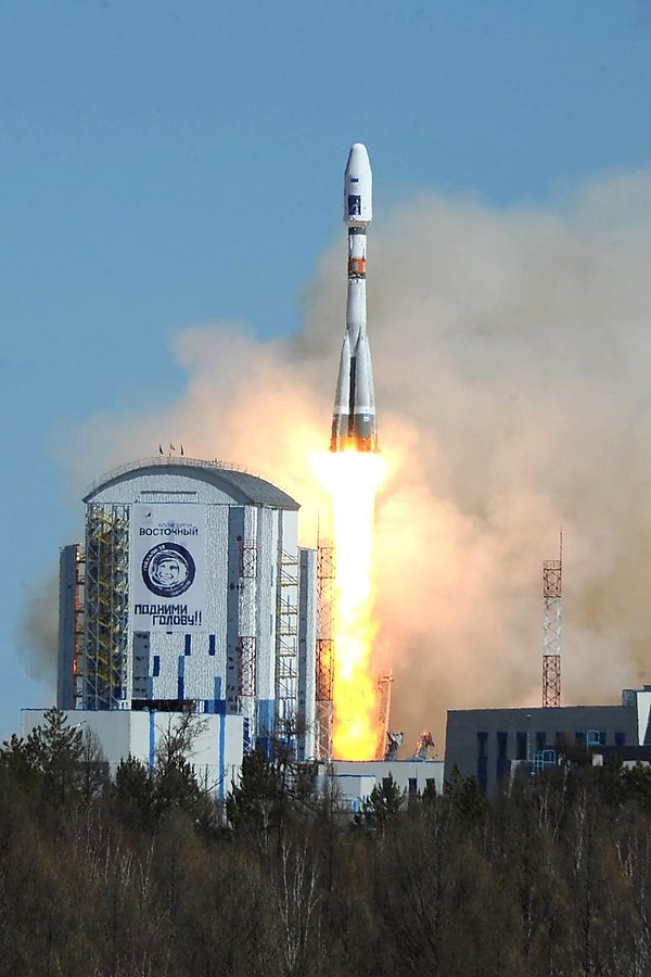 Первый запуск с «Восточного» состоялся 28 апреля 2016 года[112][113][114]. Ракета-носитель Союз-2.1а c блоком выведения «Волга» вывела на орбиту три космических аппарата: «Михайло Ломоносов», «Аист-2Д» и наноспутник «СамСат-218»[115]. Первый запуск был застрахован на 1,84 млрд рублей[116].