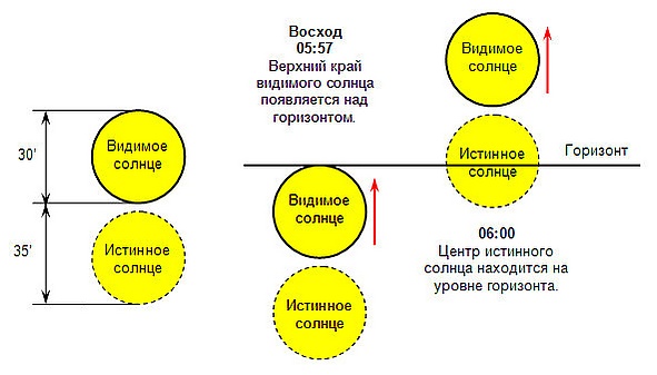 При наблюдении с Земли угловой диаметр солнечного диска составляет 32 угловые минуты (0,53°, 1/108 рад)[2]. Следствием отмеченного факта, а также формального определения восхода как момента появления верхнего края солнечного диска над горизонтом и определения заката как момента пропадания верхнего края солнечного диска за горизонтом является то, что продолжительность дня оказывается несколько больше половины солнечных суток.