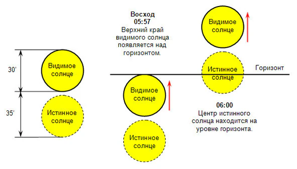 Из-за влияния атмосферы восход наблюдают несколько раньше, чем наблюдали бы при отсутствии атмосферы.