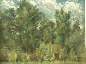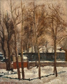 На картине представлен зимний пейзаж, в центре которого на переднем плане изображены пять деревьев, стоящих фронтально в один ряд. На втором плане расположены другие деревья, среди которых слева заметен тёмный силуэт ребёнка. Позади проходит дощатая серая изгородь и видна задняя стенка строения. За изгородью слева — частично изображённый дом, справа — одноэтажный дом с тремя трубами на заснеженной крыше. Работа выполнена преимущественно в охристых оттенках цветовой гаммы.