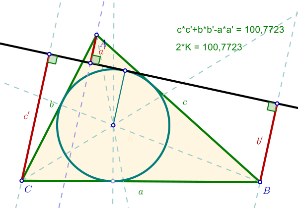 - Теорема Харкорта. Пусть треугольник задан своими вершинами A, B и C, противоположные вершинам стороны имеют длины a, b и c, площадь равна K и прямая касается вписанной в треугольник окружности в произвольной точке. Обозначим расстояния от вершин треугольника до прямой через a ', b ' и c ', при этом, если вершина и центр окружности лежат по разные стороны от прямой, расстояние считается отрицательным. Тогда: