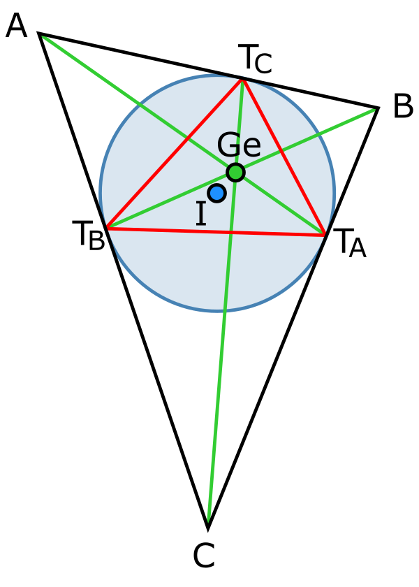 Треугольник Жергонна (для треугольника ABC) определяется тремя точками касания вписанной окружности на трёх сторонах. Эти вершины обозначим TA, и т. д.. Точка TA лежит напротив вершины A.