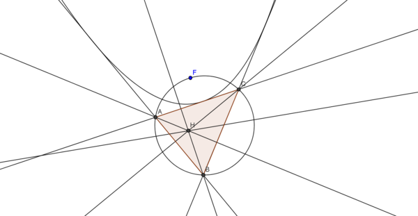 - Перспекторы вписанных в треугольник парабол лежат на описанном эллипсе Штейнера(см. выше)[10]. Фокус вписанной параболы лежит на описанной окружности, а директриса проходит через ортоцентр[11].