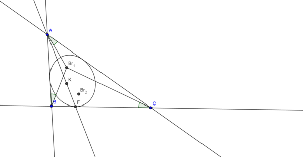 - Если вне данного треугольника ∆ABC провести через его вершины три его внешние биссектрисы, то они пересекутся в трёх центрах вневписанных окружностей, образуя треугольник трёх внешних биссектрис.