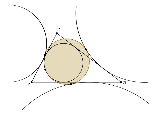 - Треугольник точек касания вневписанных окружностей для треугольника ABC (иногда именуемый треугольником Нагеля) определяется вершинами TA, TB и TC, которые являются точками касания вневписанных окружностей с соответствующими сторонами треугольника ABC. Например, точка TA противоположна стороне A, и т. д.