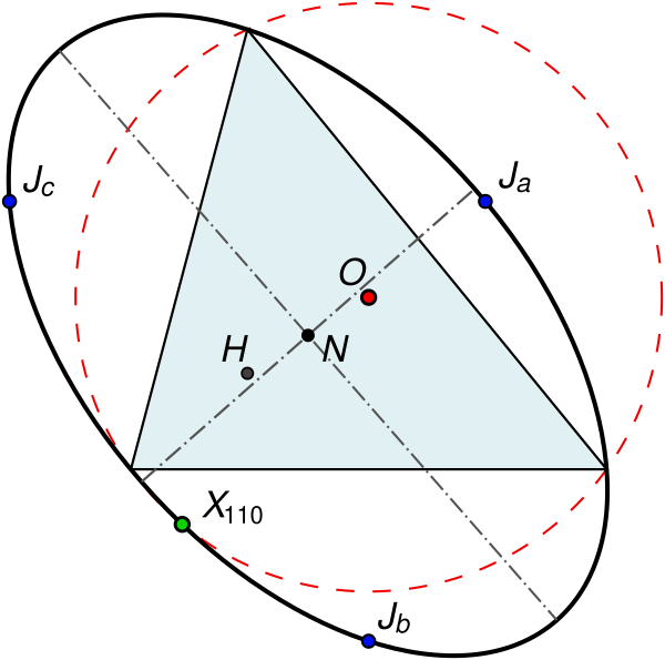 - Шесть точек — вершины опорного треугольника и вершины его треугольника Джонсона — лежат на эллипсе Джонсона (рис. слева), имеющем центр в центре девяти точек и точка X(216) опорного треугольника является его точкой перспективы. Описанный эллипс и описанная окружность имеют четыре общие точки — три вершины опорного треугольника и точку X(110).