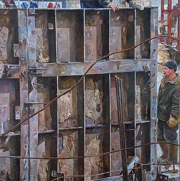 Композиция картины построена вокруг строительной площадки, что характерно для жанра индустриального пейзажа. На первом плане выделяется крупная металлическая конструкция, которую сверху поддерживают руки рабочего. Справа изображён стоящий человек в зелёной рабочей одежде, его фигура обращена в три четверти, а голова показана в профиль. На заднем плане видны металлические конструкции и две фигуры рабочих, подчёркивающие атмосферу стройки. В верхней части композиции слева представлен фрагмент зданий с витриной магазина. В работе преобладают коричневые оттенки, что придаёт сцене цельность и подчёркивает индустриальный характер изображения.