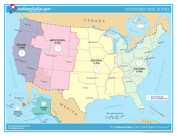 С востока на запад четыре часовых пояса Соединенных Штатов расположены следующим образом: