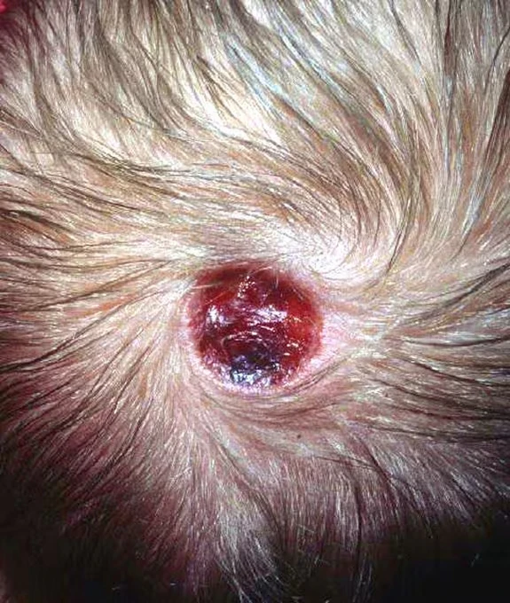 Хирургическое вмешательство показано при крупных дефектах более 4 см, глубоком поражении с вовлечением дермы, подкожной клетчатки или кости, а также при угрозе осложнений. Применяются методы первичного закрытия, пластики кожными лоскутами и аутологичной или аллогенной кожной трансплантации. При отсутствии костных структур может потребоваться ранняя или отсроченная краниопластика[2].