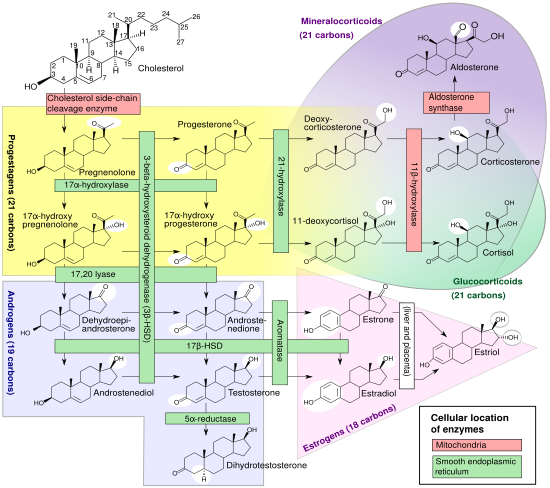 Нарушение функции 21-гидроксилазы (зелёная вертикальная плашка по центру сверху на схеме) приводит к накоплению промежуточных продуктов стероидогенеза.
