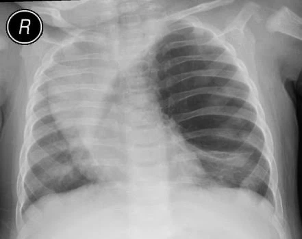 - Рентгенография органов грудной клетки — выявляется повышение прозрачности лёгочной ткани, смещение средостения в здоровую сторону, уплощение купола диафрагмы и расширение межрёберных промежутков на стороне поражения. Характерно поджатие здоровых отделов лёгкого в виде треугольной тени[4].
