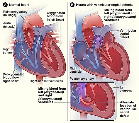 Перегородка — стенка ткани, отделяющая левое предсердие от правого. При дефектах межпредсердной или межжелудочковой перегородки кровь движется из левой части сердца в правую, уменьшая эффективность работы сердца[17]. Дефект межжелудочковой перегородки наиболее распространённый тип ВПС[18].