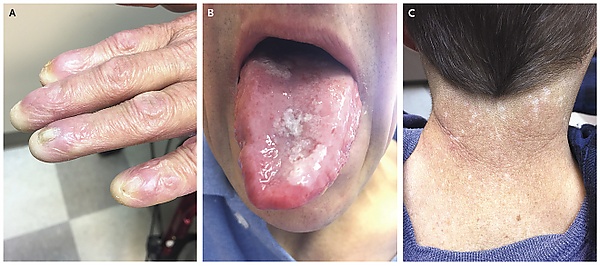 Врождённый дискератоз характеризуется поражением различных органов и систем. Начало заболевания может приходиться на детский, подростковый или взрослый возраст. Классические проявления включают дистрофические изменения ногтевых пластин, сетчатую гиперпигментацию кожи и лейкоплакию слизистых оболочек. Указанные симптомы обычно развиваются последовательно и прогрессируют по мере нарастания теломерной дисфункции[3][5].