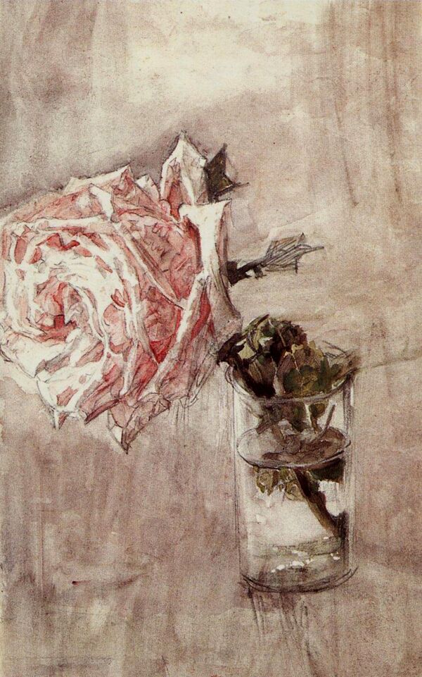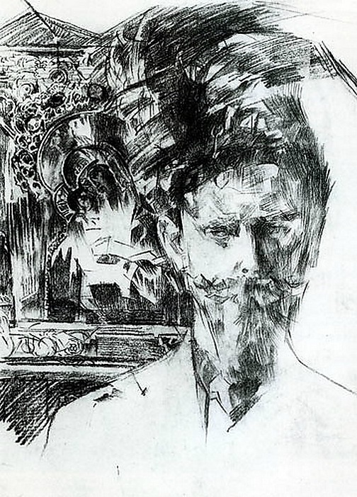 Огромную часть больничного врубелевского наследия составляли карандашные рисунки — единственная сохранившаяся серия его натурных штудий. В это время он рисовал преимущественно портреты врачей, санитаров, больных, знакомых, группы играющих в карты и в шахматы, делал пейзажные наброски, зарисовывал уголки комнаты, простые предметы — кресло, брошенное на стул платье, смятую постель (цикл «Бессонница»), подсвечник, графин, розу в стакане. Вероятно, он ощущал потребность, возвращаясь к художественному творчеству, «усиленно и смиренно штудировать натуру», о чём не уставал говорить окружающим. Вместо стилизации — «наивная передача самых подробных живых впечатлений»[135]. Среди больничных рисунков было несколько портретов доктора Усольцева, его жены, брата-студента. Существует незаконченный портрет Усольцева на фоне иконы в золочёном окладе (1904 года). Художнику удалось одним чёрным карандашом, без помощи цвета передать узорчатую фактуру фона и бликов на окладе и при этом не «потерять» лицо в дробности[143].