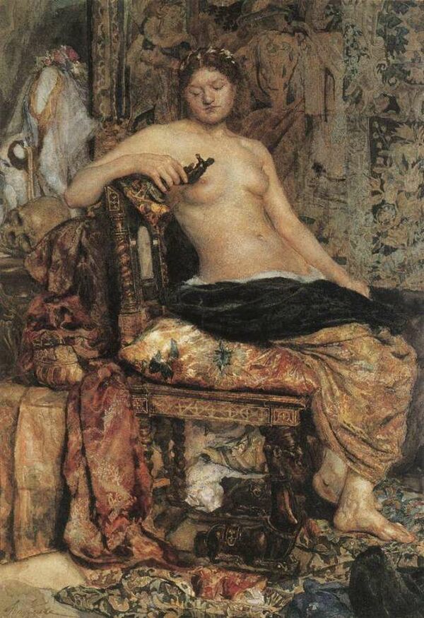 Врубель не оставил идеи соединить свои творческие искания с заработком: благодаря Папмелям он получил заказ от промышленника Леопольда Кёнига, в условиях которого сюжет и техника оставались на усмотрение художника. Гонорар должен был составить 200 рублей. Михаил Александрович решил также участвовать в соискании премии Общества поощрения художеств и остановился на теме «Гамлет и Офелия» в стиле рафаэлевского реализма. Сохранились автопортретные штудии для образа Гамлета и акварели для общей композиции, в которой принц Датский представлен художником. Это также не привело ни к какому результату, что также накладывалось на крайне сложные отношения с отцом[30]. Потерпев фиаско и с «Гамлетом», Врубель поддался уговорам друзей писать натурщицу, для чего усадили опытную модель Агафью в то же кресло, которые служило для «Гамлета», а студент В. Дервиз доставил из родительского дома флорентийский бархат, венецианскую парчу и прочие предметы эпохи Ренессанса. Результатом стала удачная работа «Натурщица в обстановке Ренессанса» с характерной для собственного стиля Врубеля «чеканкой» живописи, гранящей её форму до тончайших изгибов. Под впечатлением от «Натурщицы» Михаил Александрович вернулся к «Гамлету» — уже маслом на холсте, для которого теперь позировал В. Серов. Художник процарапал по сырой краске черенком кисти в углу следующую надпись, позволяющую судить о творческом замысле[31]: