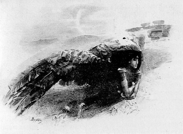 …Я пишу Демона, то есть не то чтобы монументального Демона, которого я напишу ещё со временем, а «демоническое» — полуобнажённая, крылатая, молодая уныло-задумчивая фигура сидит, обняв колена, на фоне заката и смотрит на цветущую поляну, с которой ей протягиваются ветви, гнущиеся под цветами[70].