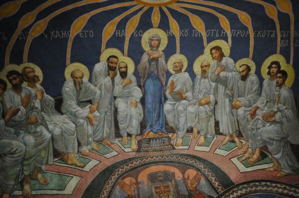 Одной из самых характерных композиций Врубеля для Кирилловской церкви стала фреска на хорах «Сошествие Святого Духа на апостолов», которая сочетает в себе точно уловленные черты византийского искусства и портретные искания молодого Врубеля. Фигуры двенадцати апостолов расположены полукругом в коробовом своде хор, в центре — стоящая Богоматерь. Фон синий, золотые лучи нисходят на апостолов из круга с изображением голубя[34]. Образ матери Спасителя писался с гостьи дома Праховых, фельдшерицы М. Ф. Ершовой (она вышла замуж за одного из художников — участников реставрации), второй апостол от левой руки Богородицы — протоиерей Пётр (Лебединцев), преподававший в Ришельевской гимназии; вторым от правой руки изображён киевский археолог В. И. Гошкевич, третьим — настоятель Кирилловского прихода Пётр (Орловский), который, собственно, и обнаружил остатки древних росписей и заинтересовал ими Русское археологическое общество. Четвёртый апостол, молитвенно сложивший ладони, — сам А. В. Прахов. Помимо «Сошествия», Врубель написал «Вход Господень в Иерусалим» и «Оплакивание»[38]. «Сошествие» писалось прямо на стене, без картонов и даже без предварительных эскизов, лишь отдельные детали могли уточняться на небольших листах бумаги. Схема росписи — полукруг апостолов, чьи нимбы соединены с эмблемой Святого Духа подобием связки, — византийского происхождения, и заимствована из чеканного складня одного из тифлисских монастырей[39].