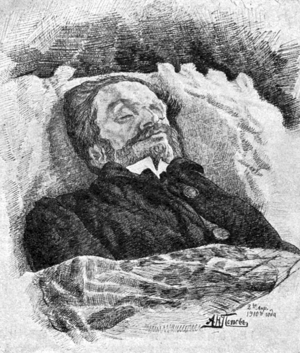 Накануне смерти (1/14 апреля 1910 года) Врубель привёл себя в порядок, вымылся с одеколоном и ночью сказал ухаживавшему за ним санитару: «Николай, довольно уже мне лежать здесь — поедем в Академию». Действительно, на следующий день гроб был установлен в Академии художеств. В алфавите погребённых записали: «Скончался от прогрессивного паралича»[160].