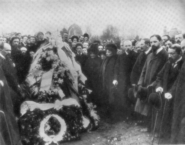 Заботу о похоронах взяла на себя Е. Ге, она же распорядилась снять посмертную маску[159]. 3 апреля состоялись похороны на кладбище Воскресенского Новодевичьего монастыря[161] в Санкт-Петербурге. Единственную речь произнёс Александр Блок, назвав художника «вестником иных миров». А. Блок над могилой Врубеля сказал: «Он оставил нам своих Демонов, как заклинателей против лилового зла, против ночи. Перед тем, что Врубель и ему подобные приоткрывают человечеству раз в столетие, я умею лишь трепетать. Тех миров, которые видели они, мы не видим»[162].