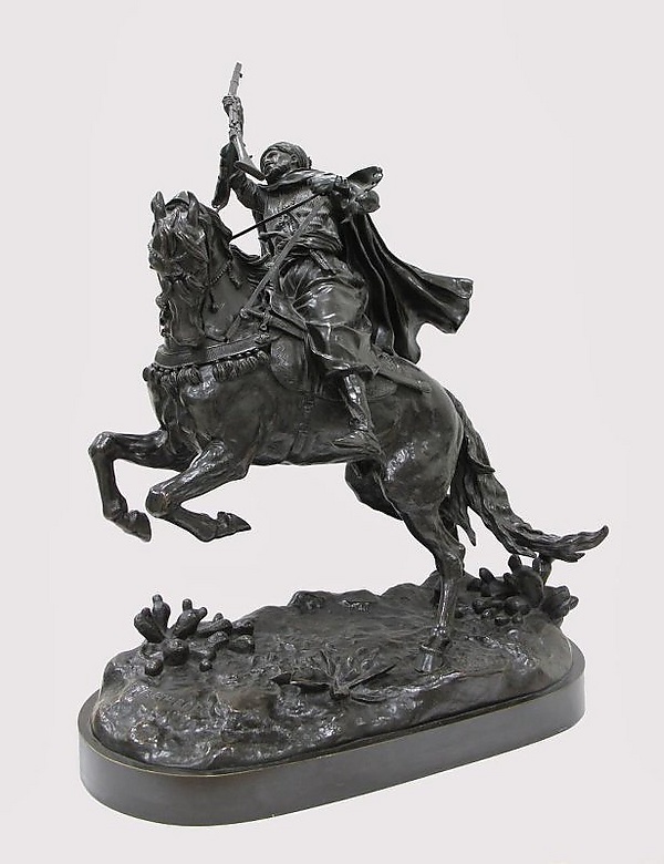 Композиция представляет круглую скульптуру. Изображён конный всадник. Он одет в рубашку, шаровары, плащ и сапоги. На голове у фигуры тюрбан. В правой руке всадник держит ружьё. За поясом расположены два пистолета. Лошадь изображена в прыжке: передние ноги подняты от земли. Размер скульптуры составляет 55,9×45,2×31,4 см. На основании постамента выполнена гравировка с надписью «отл. ШОПЕНЪ. И. БЕРТО», а на передней части — «ЛГЬП. Е. ЛАНСЕРЕ». На тыльной стороне плинта нанесены две бумажные этикетки с фрагментом лейкопластыря, на котором написано «ХММГ-368».