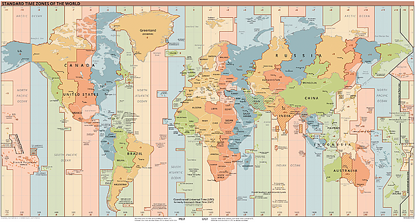 Часовые пояса по всему миру выражаются с использованием положительных или отрицательных смещений по UTC. Самый западный часовой пояс использует UTC−12, отставая на 12 часов, а самый восточный часовой пояс использует UTC+14, опережая UTC на четырнадцать часов. В 1995 году островное государство Кирибати перенесло свои атоллы на Лайнских островах с UTC−10 на UTC+14, чтобы в календарях всех островов Кирибати был один и тот же день.