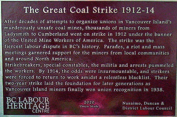 Великая забастовка шахтёров на острове Ванкувер (англ. The Great Vancouver Island Coal Strike) — одна из крупнейшей стачек, произошедших в Британской Колумбии. Стачка началась 17 сентября 1912 года[3] как протест шахтёров Камберленда против увольнения Оскара Моттишоу. Компания Canadian Collieries закрыла доступ к шахтам, и наняла китайских, британских и американских штрейкбрехеров. Остальные капиталисты острова, Роберт и Джеймс Дансмьюир следовали примеру, установленному вышеупомянутой компанией. К весне 1913 года к забастовке присоединилось около 3 500 шахтёров. Забастовку организовал американский профсоюз «Объединённые шахтёры Америки» (англ. United Mine Workers of America). Летом компания Vancouver and Nanaimo Coal уладила трудовой конфликт со своими рабочими, однако данное соглашение имело место до массовых беспорядков в шахтёрских городах. Забастовка была подавлена, поскольку правительство Британской Колумбии направило на остров 1 000 ополченцев, и многие шахтёры провели следующую зиму за решёткой. Невозможность профсоюза выплатить своим работникам пособие в период забастовки, начало Первой мировой войны положило конец стачечной борьбе ванкуверских рабочих.