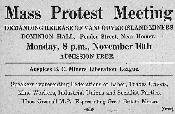 Массовый митинг был проведён в Доминион-билдинг в Ванкувере 10 ноября в поддержку арестованных шахтёров. На этом митинге было принято решение о требовании освободить арестантов. Подобного рода митинги прошли в Виктории, Эдмонтоне и других городах доминиона. Вслед за митингом в Доминион-холле власти разрешили отпустить большую часть шахтёров под залог. Однако пяти шахтёром не удалось выйти под залог. Среди них был профсоюзный активист итальянского происхождения Джо Анджело. 14 ноября перед судом предстал Крис Паттисон, профсоюзный активист, ранее приговорённый к трём месяцем заключения магистратом Симпсоном. Он предстал перед судьёй Баркером в Нанаймо. Его обвиняли в бродяжничестве, поскольку утверждалось, что он сказал «бу» полицейскому. Было вынесено решение о прекращении дела[62].