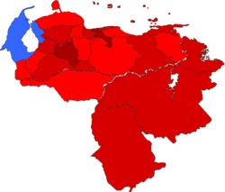 Карта результатов президентских выборов по штатам. Красным цветом обозначены штаты, в которых победу одержал Уго Чавес, синим обозначен штат, в котором выиграл Ариас Карденас | |||
