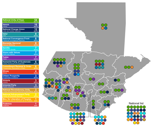 Конгресс Гватемалы состоит из 158 членов. Депутаты избираются двумя способами: 127 мест распределяются по 22 многомандатным избирательным округам, соответствующим департаментам, а оставшиеся 31 депутат — по единому общенациональному округу. Места распределяются по закрытым партийным спискам на основе пропорционального представительства, рассчитываемого по методу Д’Ондта[4].