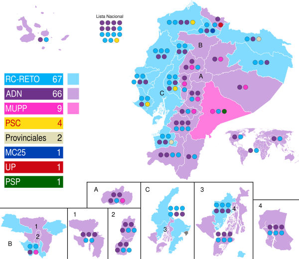 151 депутат Национального собрания избирается тремя способами. 15 — в общенациональном избирательном округе по закрытым спискам по системе пропорционального представительства. 6 — избирателями эквадорской диаспоры за рубежом (по 2 от Канады/США, Латинской Америки и Азии/Европы/Океании)[7]. Остальные 116 членов избираются в многомандатных округах по открытым спискам, при этом все места распределяются по методу Сент-Лагю. Страна разделена на 31 округ, в каждом из которых распределяется от 2 до 6 депутатских мандатов. Границы избирательных округов соответствуют 24 провинциям Эквадора, за исключением трёх наиболее населённых — Гуаяса, Пичинчи и Манаби, которые разделены на несколько округов.