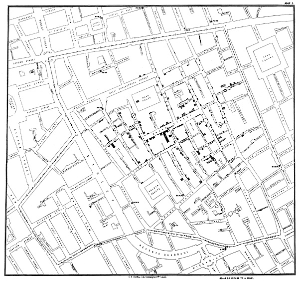 Позднее на основании собранных данных Сноу составил карту случаев холеры. На карте были отмечены места расположения водоразборных колонок и количество умерших от холеры в том или ином здании. Сноу опирался на статистические данные, чтобы твёрдо доказать связь между источником воды и заболеванием. Получившаяся общая картина эпидемии показала, что наибольшее число умерших пришлось на окрестности водоразборной колонки на Брод-стрит[4].