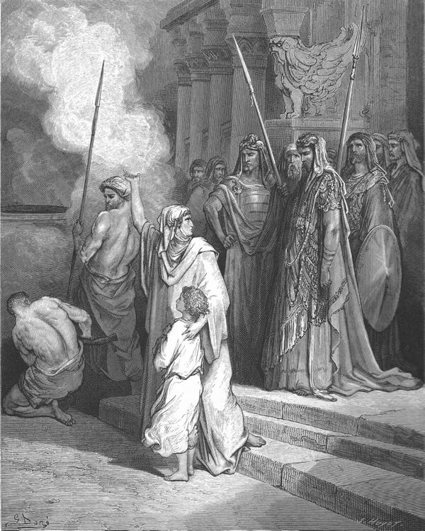 Особый пример мужества явила одна иудейка и семеро её сыновей. Молодых людей одного за другим вызывали и предлагали есть свиное мясо и делать то, что противоречило Закону. Так как ни один из них на это не соглашался, то с них живых сдирали кожу и отрубали члены тела, после чего жарили на раскалённых сковородах. Однако каждый последующий брат, видя смерть предыдущего, исповедовал свою веру и уверенность, что по воскресении Бог воздаст им за их стойкость. Когда остался лишь самый младший, Антиох попытался уговорить мать склонить юношу к отступничеству. Однако мать на родном языке призвала своего последнего сына к стойкости. Юноша героически исповедал свою веру, после чего был подвергнут более сильным мукам, чем его братья. После смерти сыновей была казнена и мать.