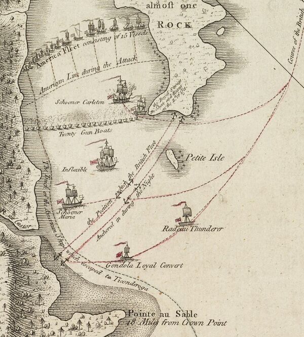 7 октября Карлтон начал движение, и 9 числа британский флот расположился на озере Шамплейн. В сражении у озера Валькур 11 октября британцы нанесли серьёзнейший урон флотилии Арнольда, заставив его отступить к Краун-Пойнту. Осознавая, что там он не выдержит атаки противника, американский генерал отступил к Тикондероге, позволив оккупировать покинутый форт 17 октября[88].