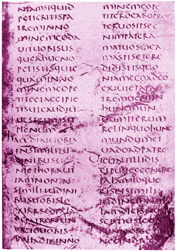 - Codex Aniciensis (4 и 42) также хранится в Национальной библиотеке Франции. Рукопись датируется IX веком (Лоуэ полагал, что рубежом VIII века), и чрезвычайно напоминает предыдущую, однако писец допустил много ошибок[59].
