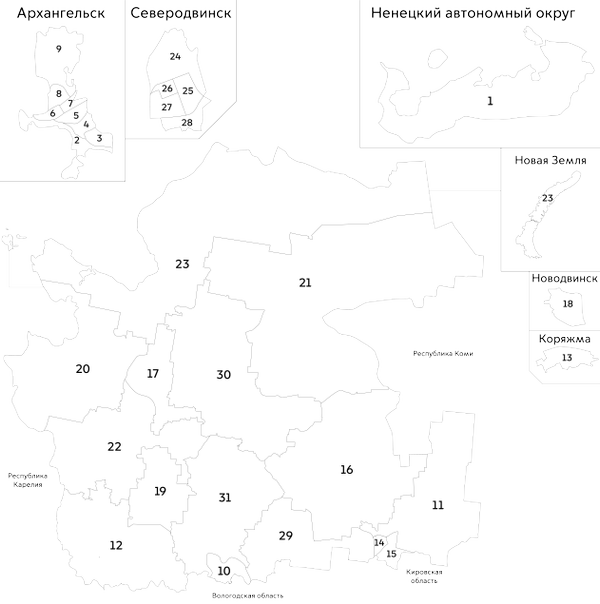 Для части выборов по мажоритарной системе Архангельская область была разделена на 31 округ, из которых 13 были в двух крупнейших городах — Архангельске и Северодвинске[3].