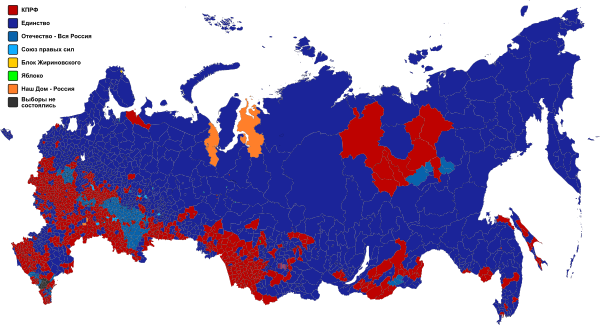 Выборы в Государственную Думу Федерального собрания РФ III созыва состоялись 19 декабря 1999 года. Выборы проводились по смешанной системе. Явка — 61,85 %. 6 списков преодолели 5%-й барьер и создали фракции в Думе (КПРФ — 90 депутатов и 39 в Аграрно-промышленной депутатской группе, «Единство» — 82 и 59 в депутатской группе «Народный депутат», ОВР — 45 и 41 в депутатской группе «Регионы России», СПС — 32, «Яблоко» — 21, Блок Жириновского — 17).!
