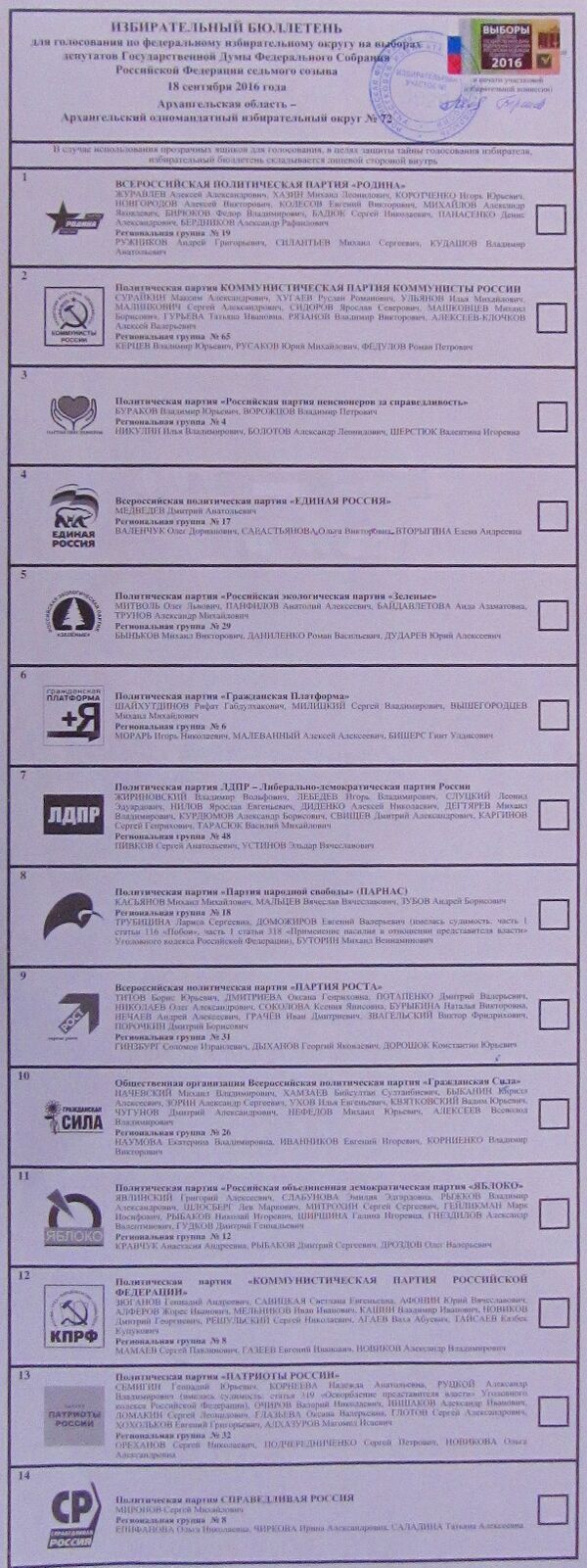 В итоге документы ЦИК РФ получил от 22 партий[25], но из них 19 выдвинули федеральные списки по единому округу («Партия родителей будущего», «Партия возрождения села» и «Возрождение аграрной России» выдвинули только списки кандидатов-одномандатников[26]).