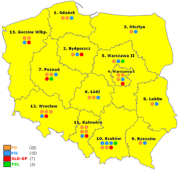 | Право и справедливость | 2 017 607 (27,4%) | 15 | ▲ 8 |