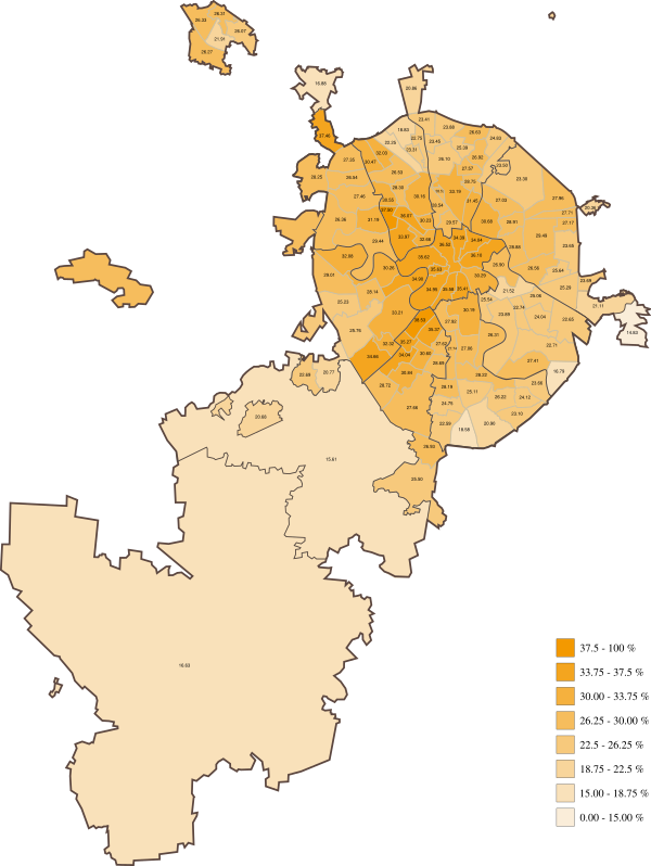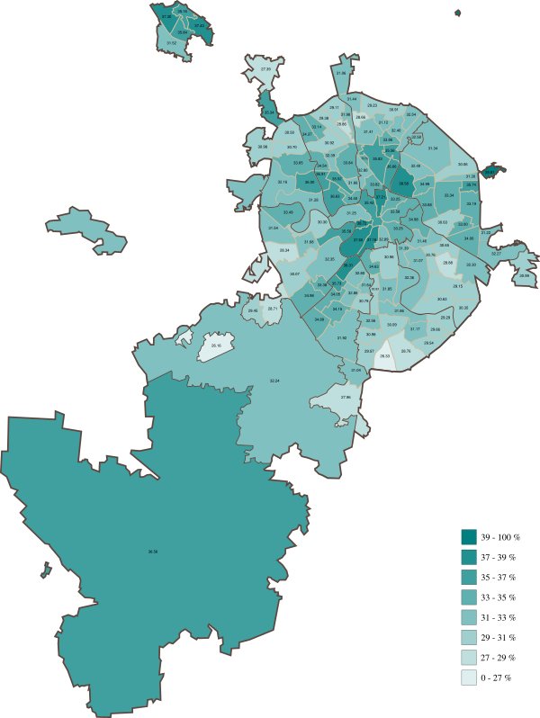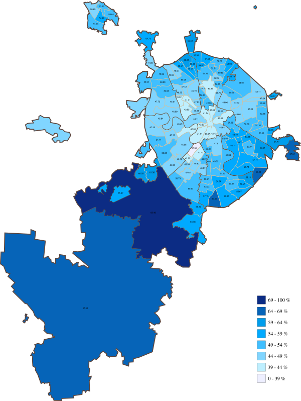 Наибольшую относительную поддержку Алексей Навальный получил в центральных районах города, а Сергей Собянин — на территории «Новой Москвы» (Новомосковский и Троицкий административные округа)[55][56].