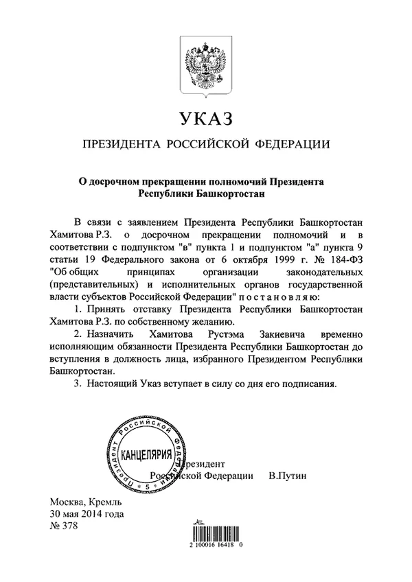 30 мая 2014 года Президент Российской Федерации Владимир Путин принял отставку Рустэма Хамитова, чтобы принять участие в выборах глав субъектов РФ, которые состоялись в единый день голосования 14 сентября 2014 года. По мнению экспертов, перенесение выборов связано с проведением в следующем году в Уфе саммитов ШОС и БРИКС[4].
