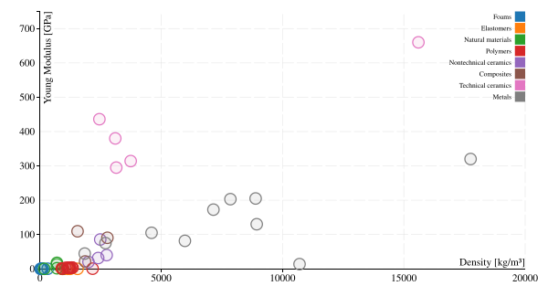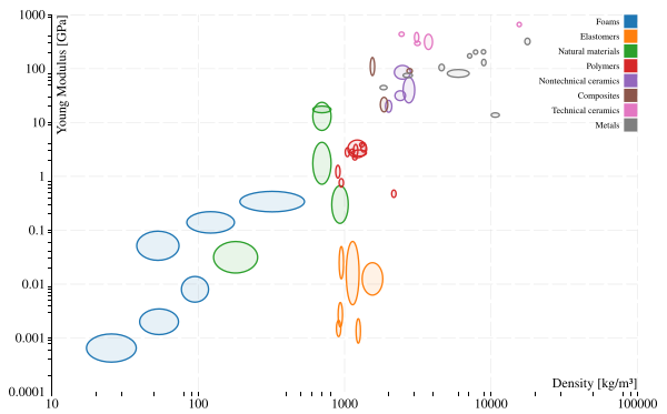 Верхняя диаграмма справа показывает соотношение между модулем упругости и плотностью в линейном масштабе. На диаграмме ниже показаны те же самые свойства материалов в логарифмическом масштабе. Разными цветами показаны разные классы материалов (полимеры, пенопласты, металлы и т.д.)[6].