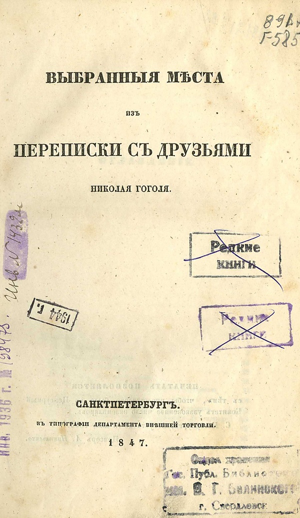 Весьма ощутимый удар нанесла книге цензура: пять писем-статей были исключены вовсе, в других сделаны купюры и исправлены отдельные места. Встревоженный и огорченный Гоголь жалуется графине Анне Михайловне Виельгорской: «В этой книге все было мною рассчитано и письма размещены в строгой последовательности, чтобы дать возможность читателю быть постепенно введену в то, что теперь для него дико и непонятно. Связь разорвана. Книга вышла какой-то оглодыш» (из письма от 6 февраля (н. ст.) 1847 года)[3].