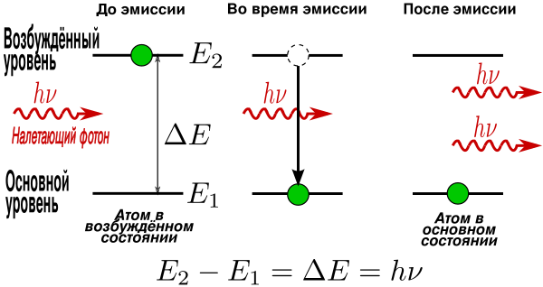 - кроме того, как и в отсутствие возбуждающего поля, остаётся возможным самопроизвольный переход молекулы (атома) с верхнего на нижний уровень с испусканием фотона энергией (см. рис. 1в).