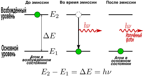 - перейти с более высокого энергетического уровня на более низкий с испусканием фотона энергией (см. рис. 1б);
