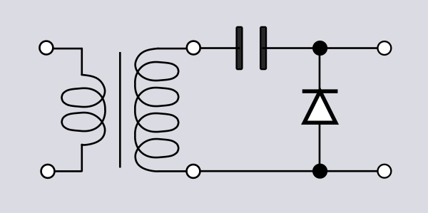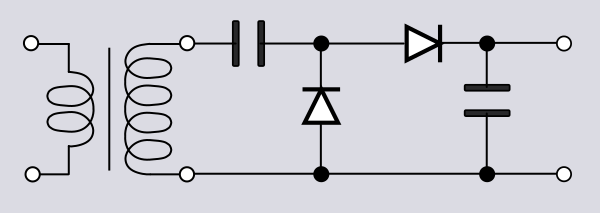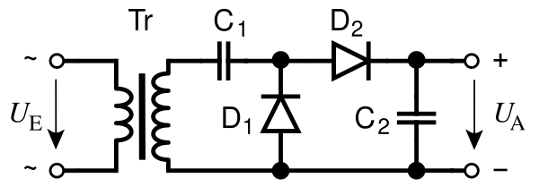 Предложен Виллардом в 1901 году[16]. Состоит из конденсатора, включённого последовательно с обмоткой, и диода, включённого параллельно нагрузке. Во время отрицательного полупериода ток течёт по цепи: «источник переменного тока — конденсатор — диод», конденсатор заряжается. Во время положительного полупериода заряженный конденсатор включается последовательно с обмоткой трансформатора, и напряжения на конденсаторе и обмотке суммируются.