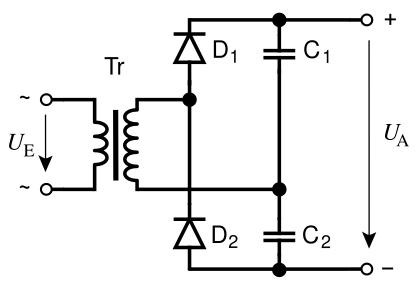 Мостовой удвоитель напряжения напоминает мост Гретца, но в отличие от него в одном из плеч моста вместо диодов установлены конденсаторы. За счёт этого во время каждой полуволны во входную цепь подключается то один, то другой конденсатор, а напряжение на выходе выпрямителя складывается из напряжений на двух конденсаторах.