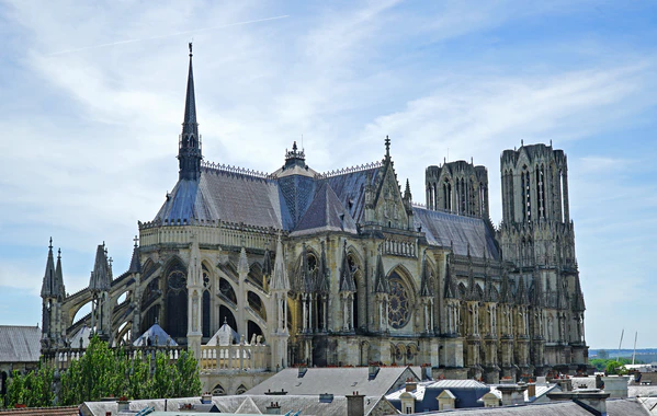 В Реймсе короли из династии Капетингов короновались, поэтому храм имел особое значение[1]. В 1210 году пожар практически уничтожил прежнее здание, после чего в 1211 году было заложено значительно более амбициозное и величественное. Из-за восстания в 1233 году работы прервались на три года. Хоры завершены в 1241 году, строительство фасада не начиналось до 1252-го, а колокольни окончены только в XV веке[7].
